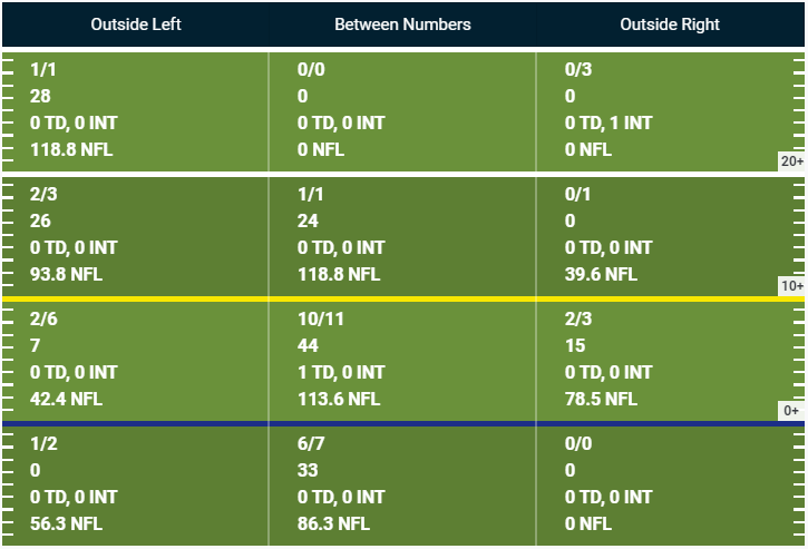 One of the weird little tidbits from last year’s PFF data is that Chase was much more successful throwing to the left side of the field than the right, and that pattern has continued for one more game. I have no explanation.