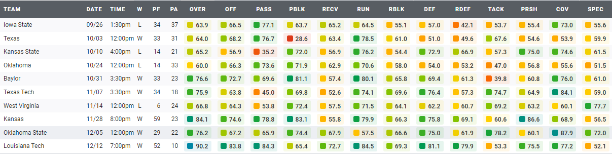 You’ll note a general pattern of improvement that isn’t entirely down to schedule strength. Sure, playing Kansas and Louisiana Tech is easier than Iowa State and Oklahoma, but TCU also put out a strong late-season performance against Oklahoma State.