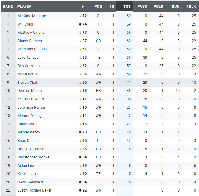 Conversely, Cal’s pass blocking graded ahead of Cal’s passing and receiver ratings, indicating that pressure wasn’t the primary issue for Cal’s air attack.