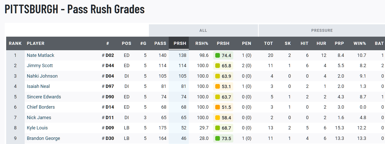 Pittsburg brings LB pressure more often than Cal (Cade and Teddye’s pass rush% are 1/3rd of Louis and George). With Louis and George coming into the rush 28-29.7% of the time, most of the time Cal will have to reckon with a straight 4 man pressure packages. The battle to watch will be Nate Matlack #2 who usually lines up on the right handside of the OL which means the embattled TJ Session will have to step up against a pass rusher with a lot of pressures to his name. (to compare, Matlack has the same pass rush win rate as Cal’s leading pressure generator in Xavier Carlton, both woth 10.7 win rates).