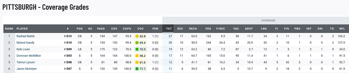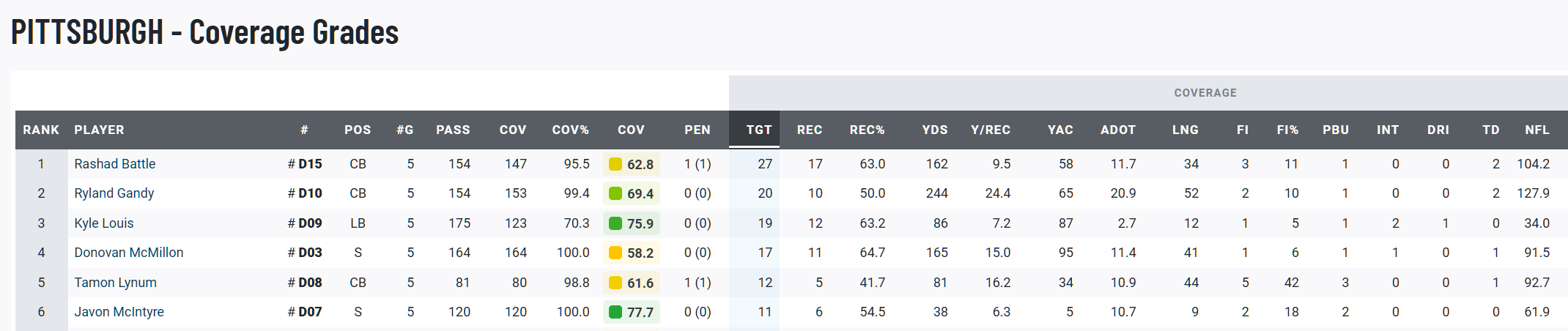 We can see here that the CB with the most targets and allowed catches is Rashad Battle it is worth noting that on his 27 tatgets he forced 3 incompletions and allowed 2 TDs. Ryland Grady on the flipside has faced fewer passes and allowed a lower completion rate, but when he does allow a completion it goes for more and for as many TDs as Battle.