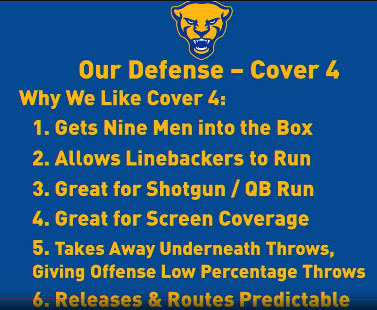 You can see here that Pitt will come out in an aggressive and downhill mindset. His main aim is to stop the run in order to force the opposing offenses to be one dimensional, and leave the corners on man-press to force high difficulty plays. Philosophically this is a simple approach and thus easy to instill defense wide.