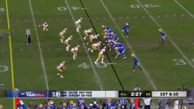 Here Holstein catches the defense off-guard with an empty backfield on 3rd and long:
