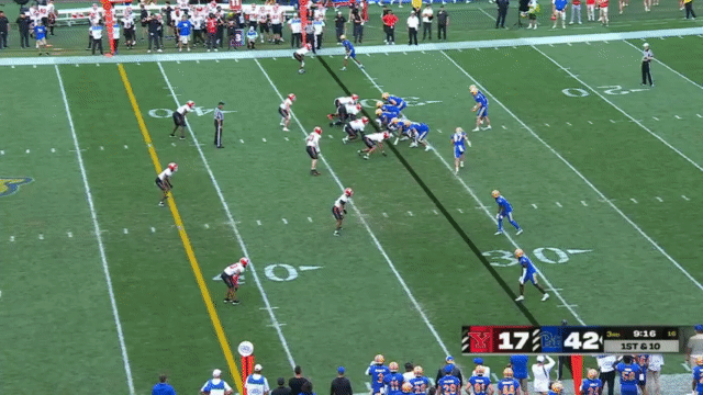 The tight end, Gavin Bartholomew, is a solid blocker with prototypical TE size (6’5 250 lbs), but he hasn’t made too much of an impact on the passing game so far this season. He shows a lot of versatility lining up all over the field (inline, the slot, out wide, at H-back, etc), and he’s often used in run-blocking situations. Here’s an example where he takes the handoff on a jet sweep: