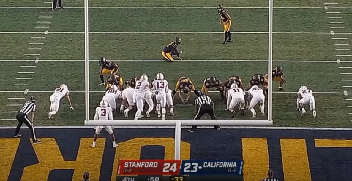 A muffed punt, a blocked field goal, and a blocked extra point. Swing any one of them and Cal at least takes Stanford to overtime.