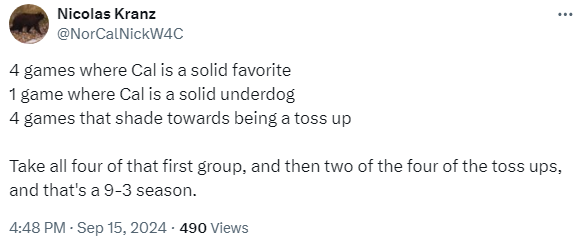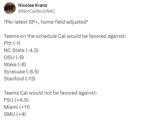 Miami is the only surefire top 25 team on Cal’s schedule. Cal is categorically better than at least four of the remaining nine teams on the schedule, and only one team is categorically better than Cal.