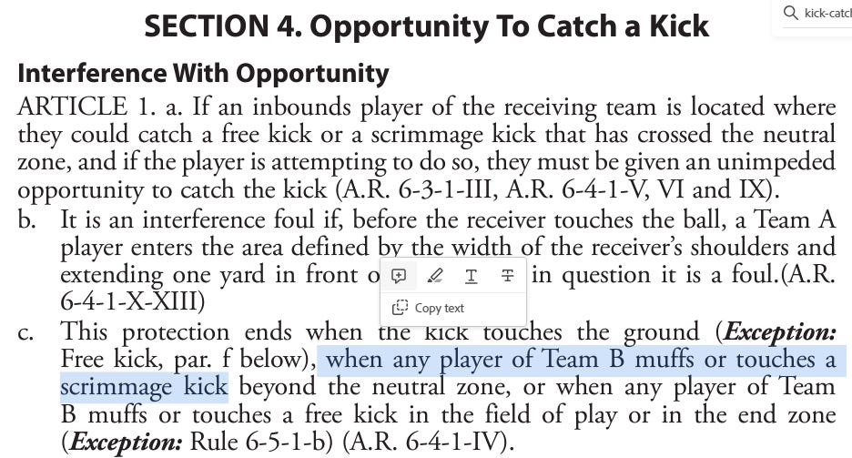 I spent some time trying to slog through the NCAA football rule book regarding kick-catch interference. Here’s the rule, highlight mine:
