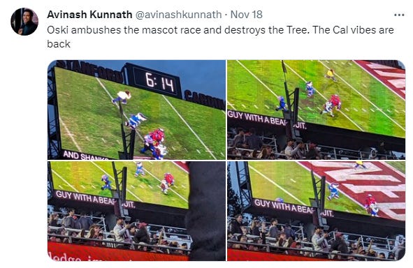 It also makes sense that each of these mascots along with the tree were absolutely smoked by Oski in the 25 yard dash, because winners win: