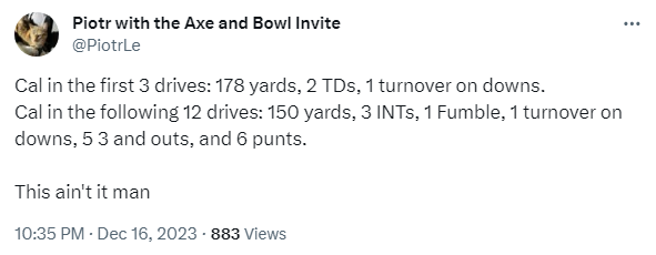 This wasn’t a game where Tech found a play or a matchup that Cal couldn’t stop and exploited it all game long. I think in another universe where the other two phases play well, we’re talking about how the Cal defense weathered some early wobbles and then gave Cal a chance to win.