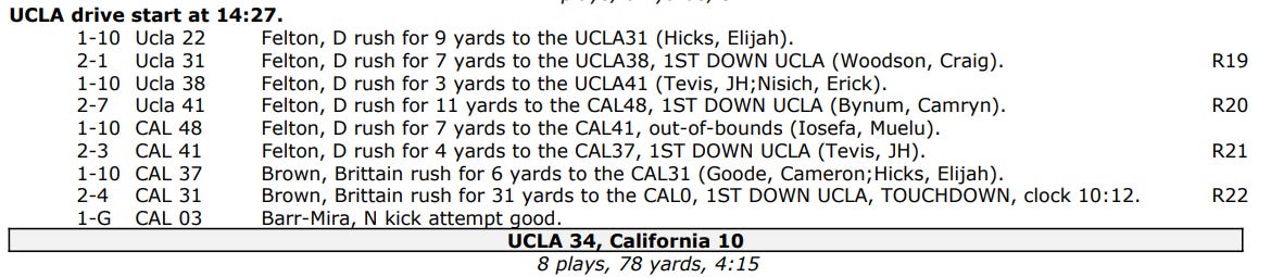 But as the game went along UCLA was increasingly able to run their offense with minimal disruption from the Bears, and I couldn’t help but wonder if the Bears and particularly the line began to wear down. Whether from lack of depth, conditioning, quarantine disruptions, or all of the above, it wouldn’t surprise me if Cal had trouble maintaining the intensity needed to play against UCLA’s offense. It felt poetic that UCLA needed 15 plays for their first TD drive, then 9 plays for their second drive, then just 5 plays for their third. By the time the 2nd half rolled around and Cal’s offense was clearly not going to be able to function, the result was this demoralizing drive that ended the game as a competitive contest: