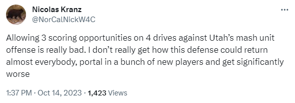 The problem is that we’re a long way removed from the last truly impressive Cal defense in 2019. In 2021 and 2022, the Cal defense was solid. Probably Pac-12 average. It was no longer the always good, occasionally dominant unit we saw from 2017-2019.