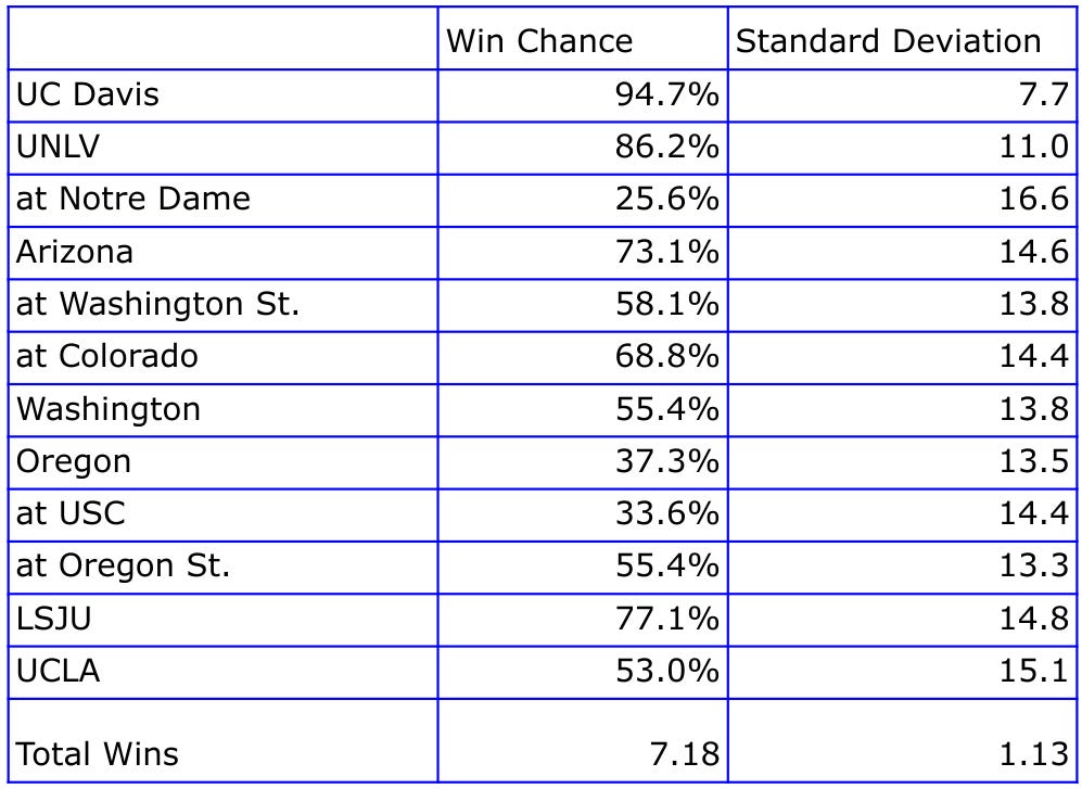 A win over Davis is a foregone conclusion and a 2-0 record after UNLV is very likely. Unfortunately, a 2-1 record after the trip to South Bend is the likeliest outcome. After that, a 3-1 record after Arizona is most likely. Then we’re split between a 4-1 record and a 3-2 record after the trip to Pullman. 4-2 after Colorado is most likely, followed by 5-2 after UW. The team has never achieved a 5-2 record under Wilcox, so that would be an impressive feat. Unfortunately, that’s when schedule gets much more difficult. After the Oregon and USC games, the Bears are still most likely to be stuck at 5 wins, although after a trip to Corvallis the Bears are likely to return home with a 6-4 record and bowl eligibility. The Bears cross the 7-win mark after the Big Game and then finish the season 7-5. A 7-win season (25%) is barely more likely than an 8-win season (23%), while 6-win (19%) and 9-win (13%) games aren’t inconceivable.