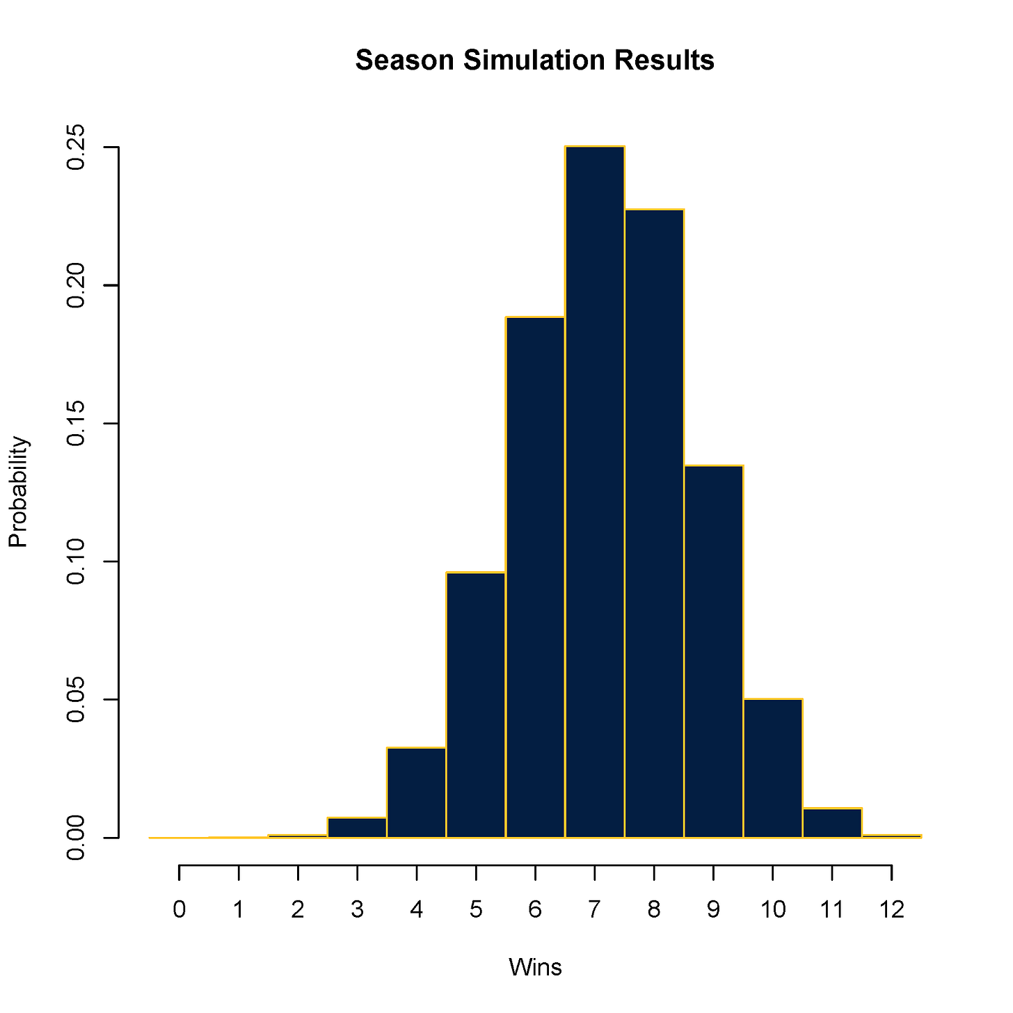 7 wins is the likeliest outcome, followed by 8 and then 6. Fortunately, there’s only about a 15% chance that the Bears fail to achieve bowl eligibility—that would require another winless season in coin-flip games.
