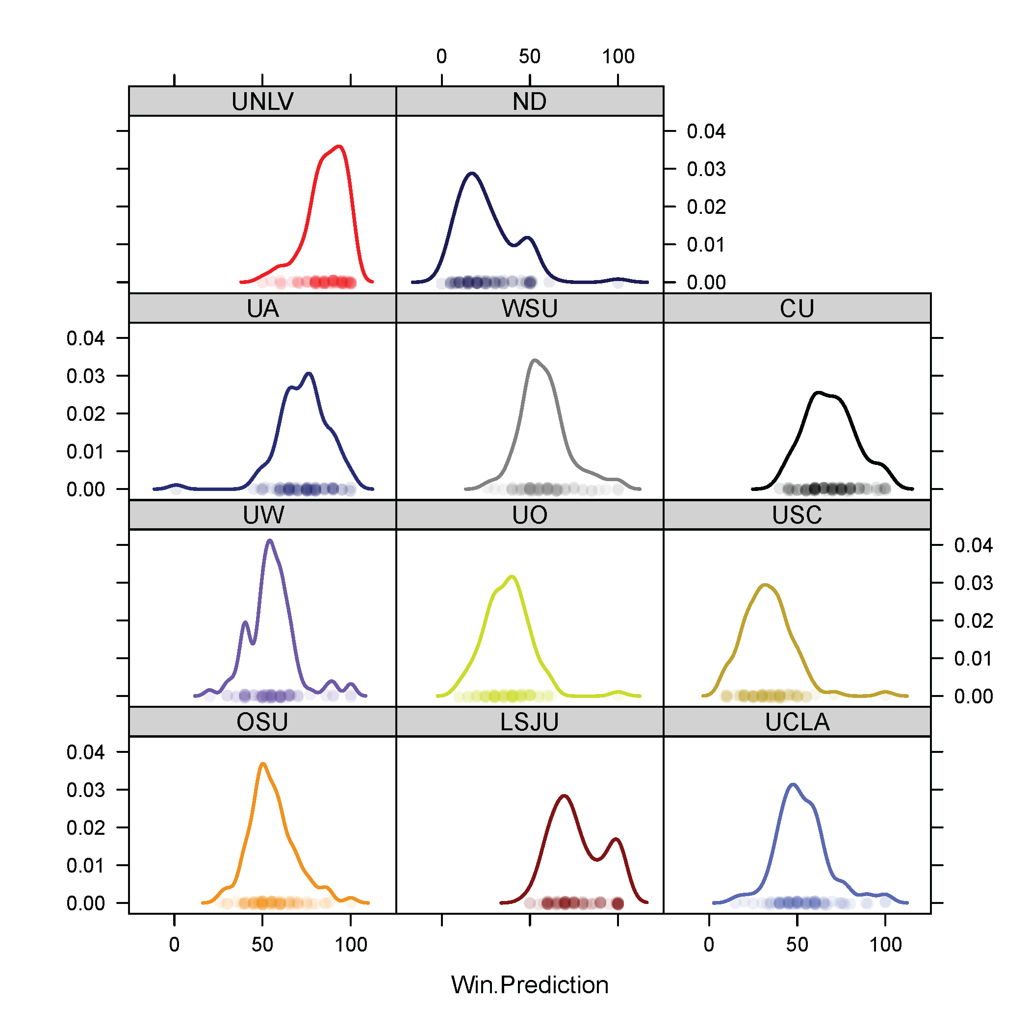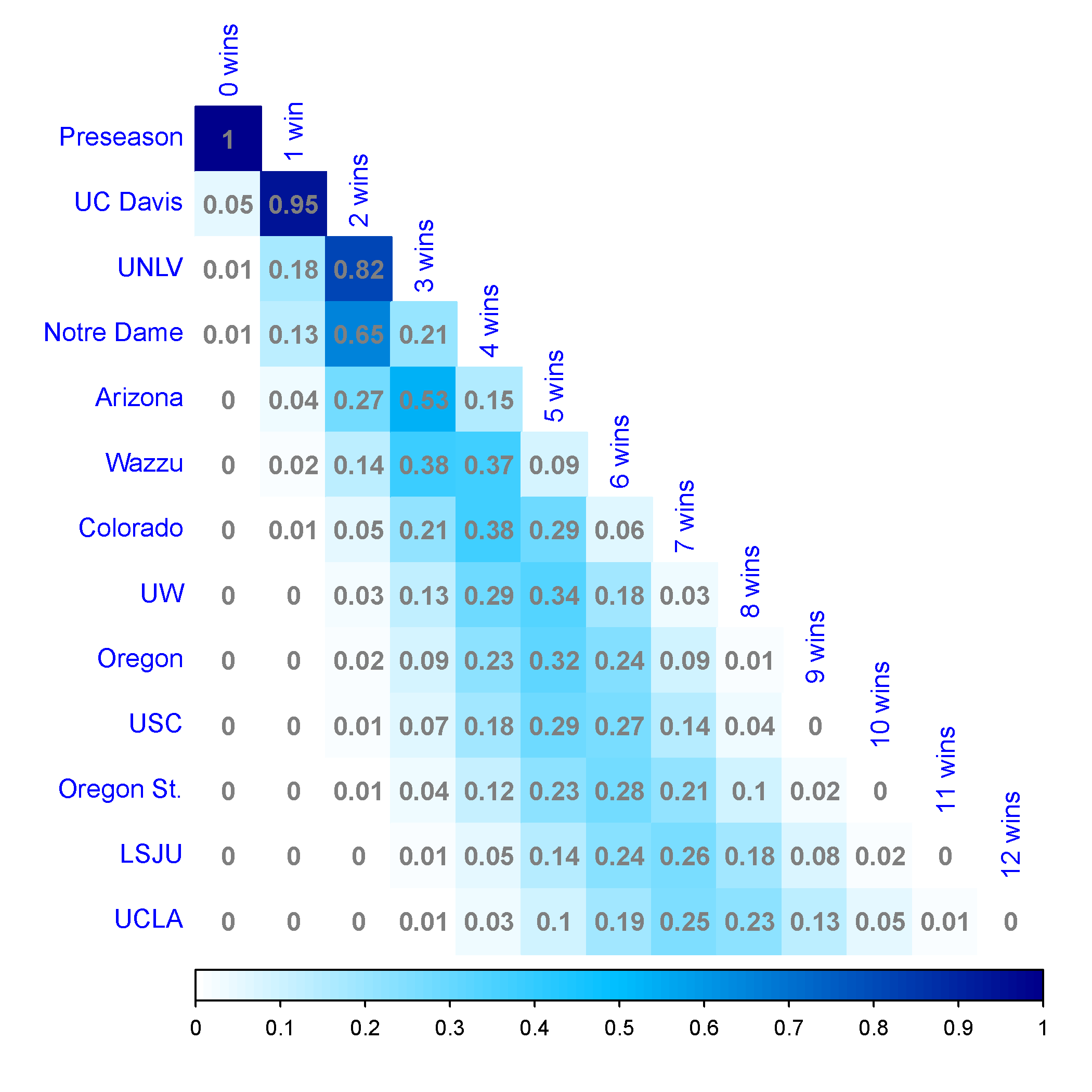 Moving beyond the win total, we can look at how likely the Bears are to achieve each possible record after each game. So we can see how likely 1-0 is after Davis vs. 0-1. Or 2 wins vs. 1 win vs. 0 wins after UNLV. In the plot below the numbers represent the likelihood that Cal achieves each record and the squares are color-coded such that likelier outcomes are darker blue.