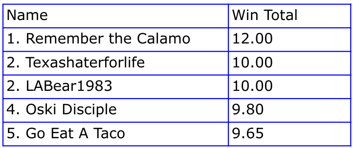 I suppose it’s encouraging that the top-5 aren’t filled with unrealistic 11-12 win projections (sorry, Calamo). Those 9-10 game projections are feasible if the offense magically rights itself and all the coin flips go Cal’s way.