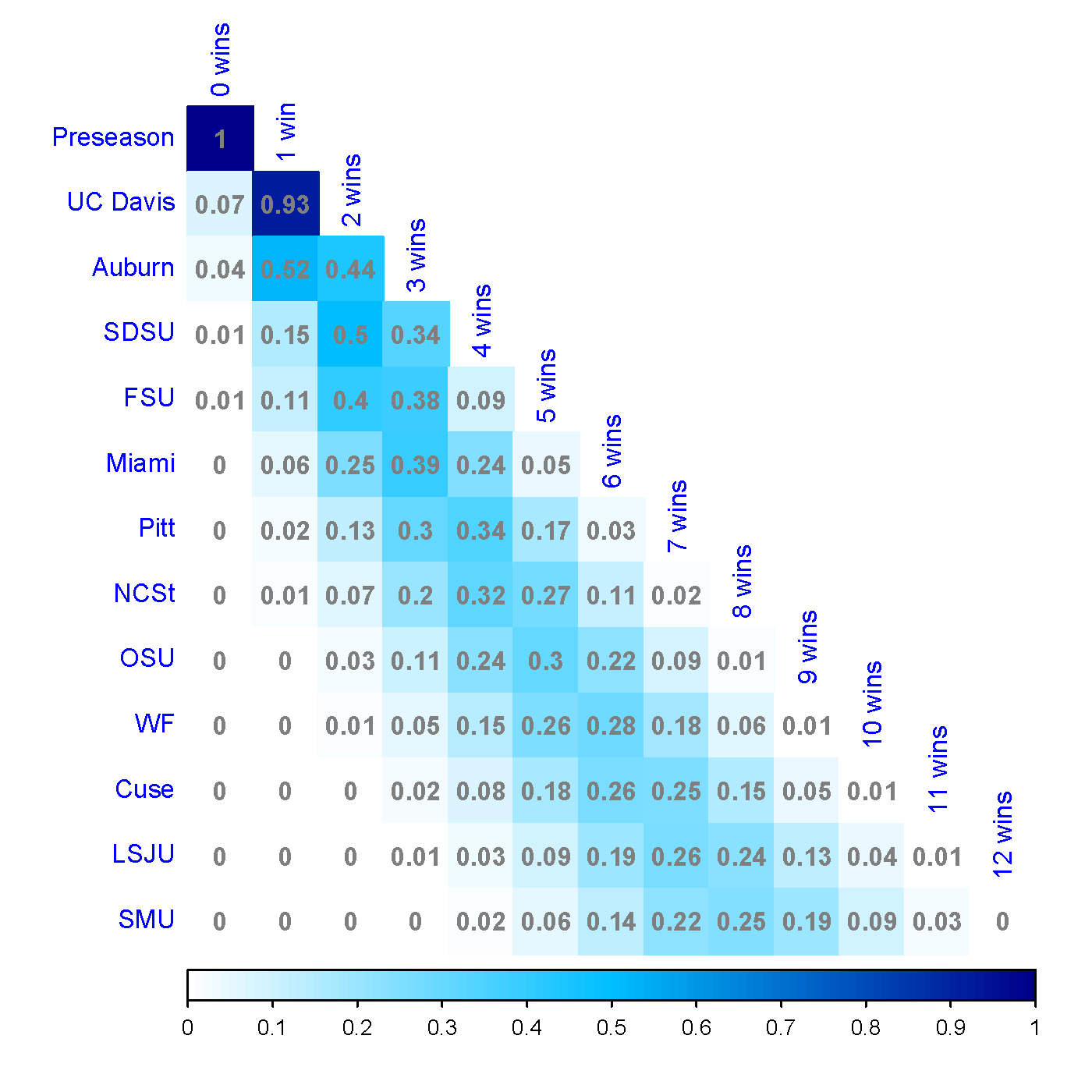This next plot shows how likely each win-loss outcome is after each game. After UC Davis we have a 93% chance of being 1-0 and a 7% chance of being 0-1. After Auburn it’s a 4% chance of being 0-2, 52% chance of being 1-1, and 44% chance of being 2-0. And so on down through the schedule.