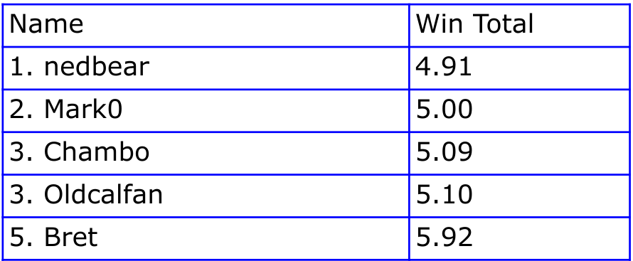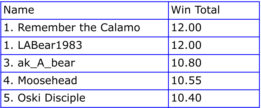 nedbear finished in the top spot once again, but the 4.91 projected wins nearly double last year’s most pessimistic prediction of 2.5 wins. With nearly 200 predictions, it’s quite impressive that only a handful had the Bears failing to achieve bowl eligibility.