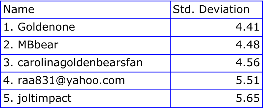 Finally, we have those whose predictions were closest to the community averages for each game. We calculated the number of standard deviations each prediction was from the hivemind’s prediction, and then added them up across all twelve games.