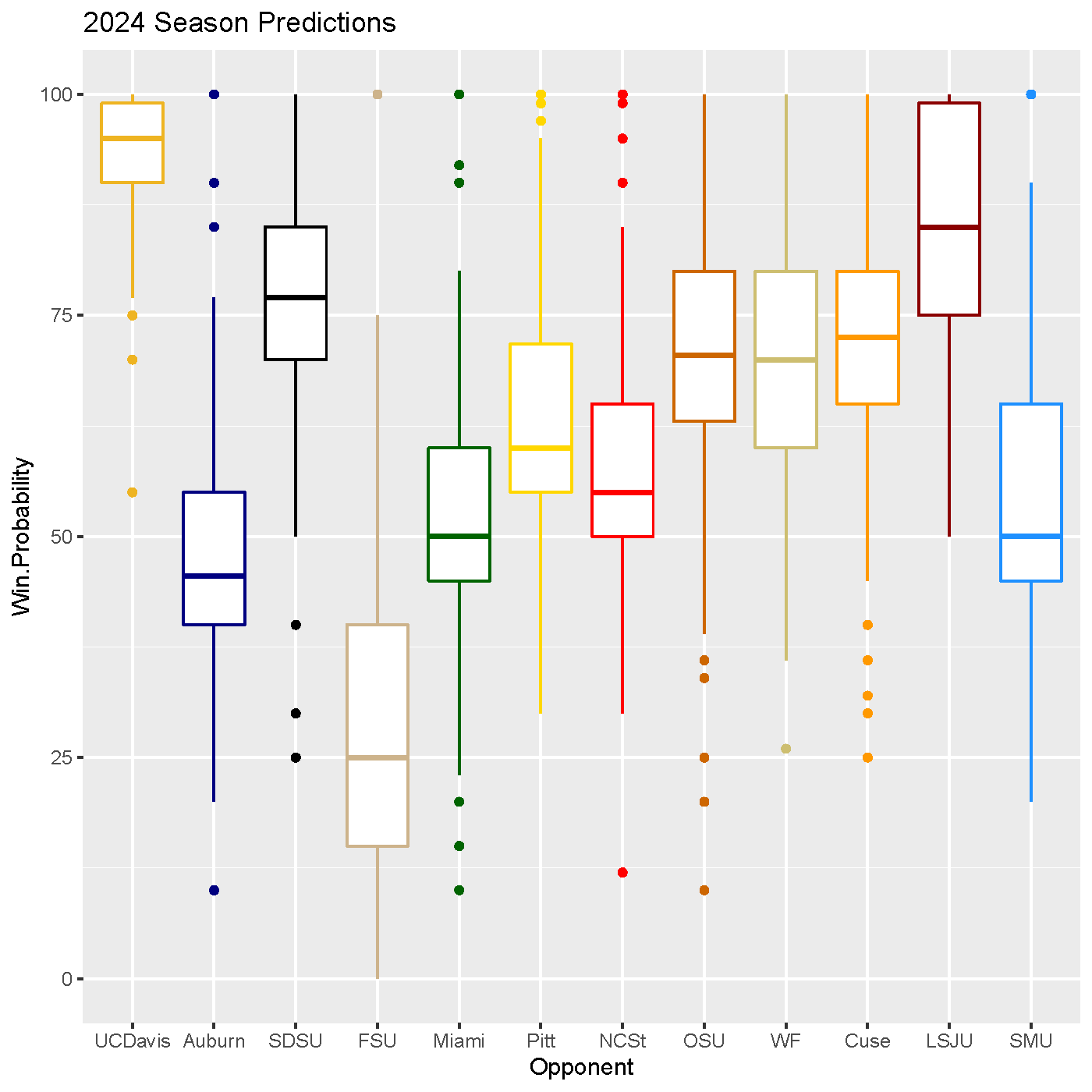 The patterns of the medians show three distinct periods in the schedule: an up-and-down start, a bunch of toss-ups, and then a gentle finish against the dregs of the ACC (except SMU, who should be decent). The team starts the year bouncing between likely wins (Davis, SDSU) and tough matchups (at Auburn, vs. FSU). 2-2 seems likely after those first four. Then comes a three-game stretch that will define the season. Cal plays three consecutive toss-up games vs. Miami, at Pitt, and vs. NC State. Win none? Bowl eligibility will be a struggle. Win 1? 6-7 wins seems likely. Win 2? We’re well on our way to 8 wins. Win all 3? ACC CHAMPIONSHIP HYPE TRAIN LEAVES THE STATION! After those toss-ups Cal plays a relegated Oregon State team and then three games against teams that combined for 5 wins and 20 losses in conference play in 2023. Based on the probabilities, it seems likely Cal will lose one of those. But it’s a much easier November than any schedule in recent memory. Finally, the Bears end the season with a toss-up against SMU.