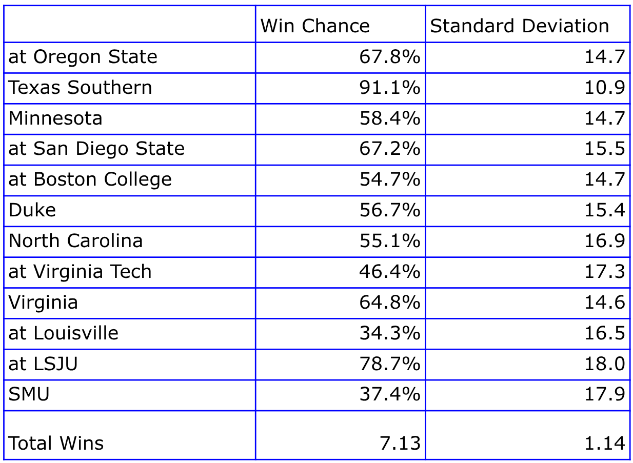I tend to think of these games as five classes of outcomes: chances under 15% are certain losses, 15%-39% are probable losses, 40-60% are toss-ups, 61-85% are likely wins, and 85+% are certain wins. According to that, we have 0 certain losses (yay for a weak ACC!), 2 probable losses (Louisville, SMU), 4 probable wins (OSU, SDSU, Virginia, LSJU), and 1 certain win (Texas Southern). That gives us 4-5 wins. And then we have our five, season-defining toss-ups: Minnesota, Boston College, Duke, North Carolina, and Virginia Tech. Better yet, these five all occur within a six-game stretch. After the Virginia Tech the next four games are in the “probable” range (Cal likely splits those and goes 2-2). So after that stretch of toss-ups we should know the fate of the season (and perhaps the fate of the Wilcox Era) following Cal’s Friday night game in Blacksburg, VA. But before we venture into where this season takes us, let’s have a look at each individual prediction.