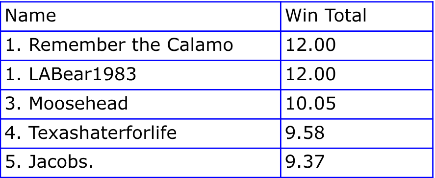 Like last year, Calamo and LABear predict perfect seasons, followed by a bit of a gap to those who think all these coinflips will go in our favor (and then some).