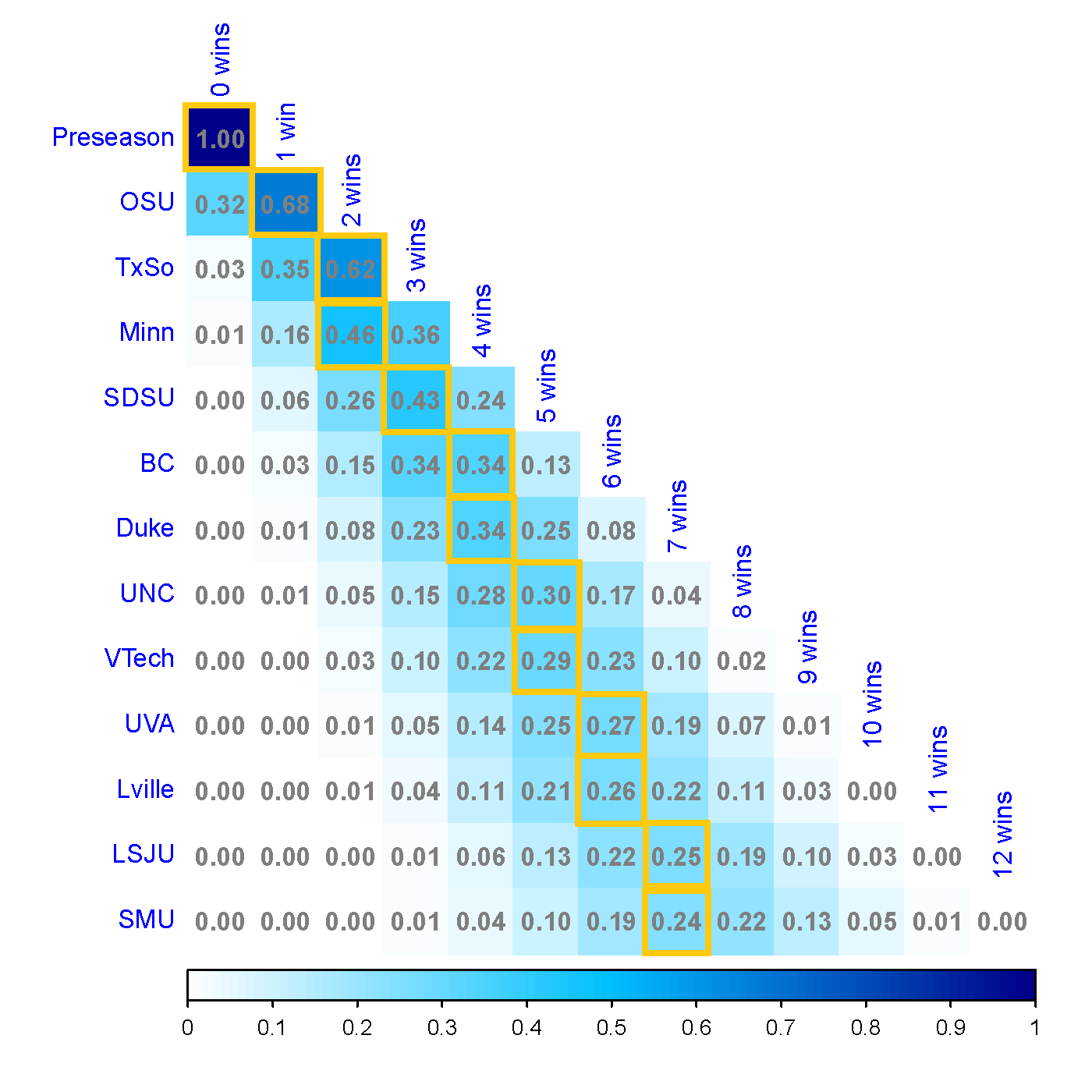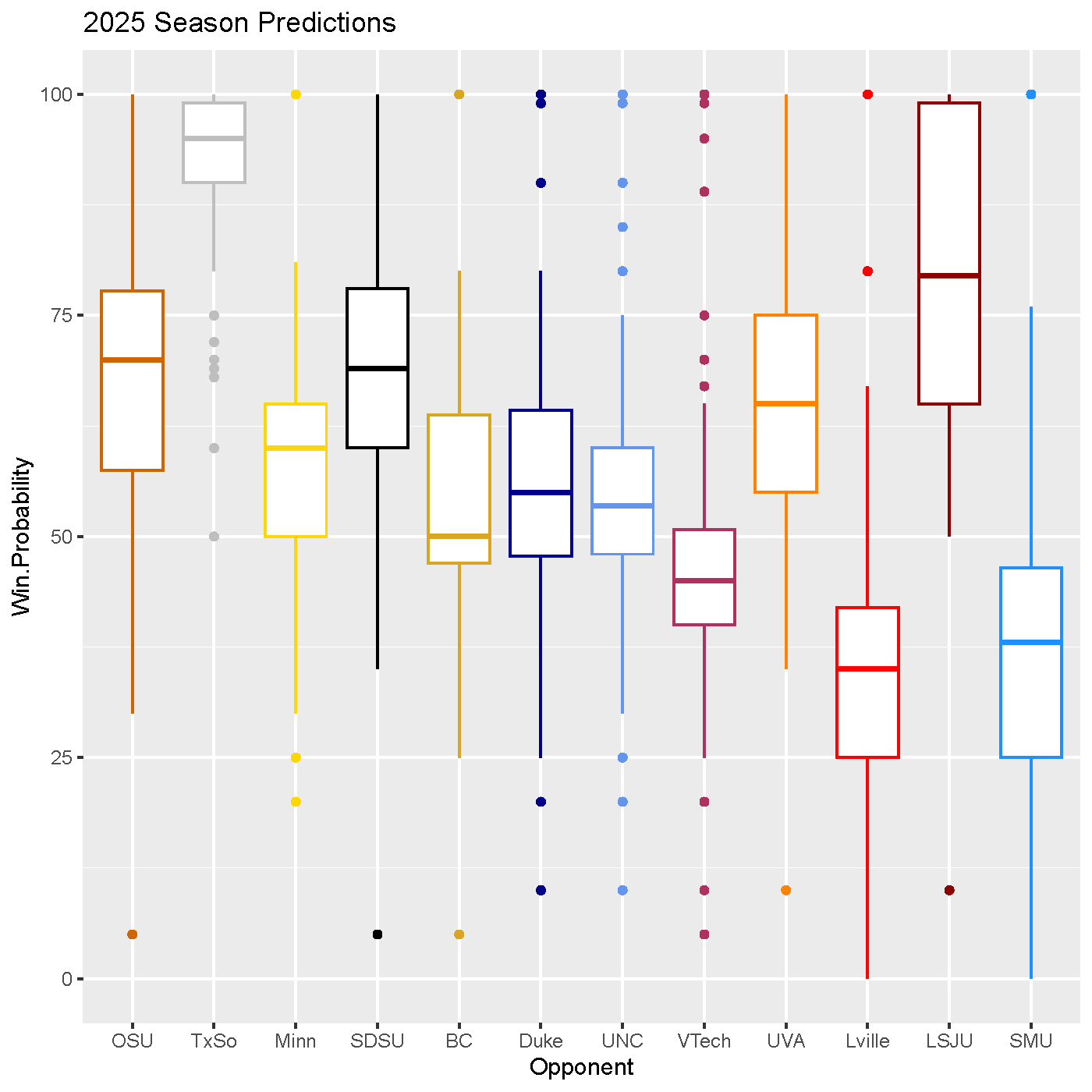 From here we can visualize our different classes of games ranging from the trivial win (Texas Southern) to the two probable losses (Louisville and SMU). Interestingly, several of those toss-up games have smaller interquartile ranges (the length of the box); that is, we tend to agree that we don’t know what to expect in those games.