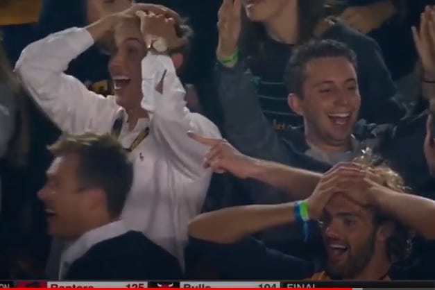 I have some practical work experience with respirator safety, so I’m going to screen cap every time the broadcast shows a fan wearing some sort of face covering that either 1) would not prevent smoke inhalation or 2) is worn incorrectly, thus preventing you from benefiting from the respirator. Here’s our first candidate, and I’m hoping, our last: