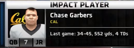 I still can’t get over the EA Sports Chase Garbers avatar. Not because it doesn’t look like Chase, but because this doesn’t look like ANY college player. Dude has the male pattern baldness of a 40-something guy who retired from the NFL a decade ago.