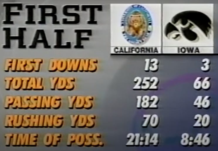 Iowa has been able to get to Barr from time to time (primarily by attacking the left side of Cal’s line, which doesn’t feature Todd Steussie) and this time they force a fumble and recover. For the first time Iowa gets into the red zone.