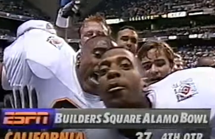 Play-by-play man Sean McDonough clutches his pearls and has the vapors: “And Todd in my opinion that’s kind of borderline acceptable behavior in a bowl game especially on the part of Cal already ahead 30-3 with 8:00 minutes to go, dominating the game in every way to run a play action fake and throw it in the end zone, at least raises the question about running up the score a little bit. How I feel about this as a Cal fan is perfectly expressed by the Cal players shown on screen while McDonough moralizes about an exhibition game designed to line the pocket of the San Antonio Chamber of Commerce: