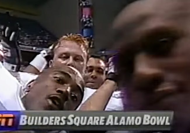 Speaking of advertising - rather than commenting on the game (which admittedly is out of hand) ESPN is interviewing the CEO of the Alamo Bowl, who coincidentally also is the CEO of Builder’s Square. What a coincidence!