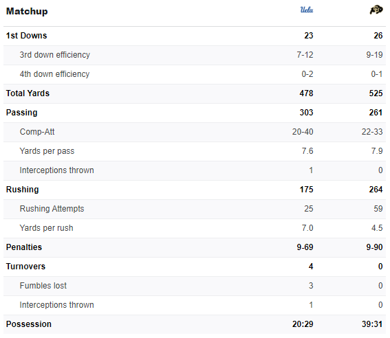In some ways, 48 points feels unfair for the UCLA defense. After all, they didn’t turn the ball over 4 times (plus two turnovers on downs) and Colorado had three touchdown drives of 25, 7, and 1 yard. One could argue that UCLA’s defense really only gave up 27 points!