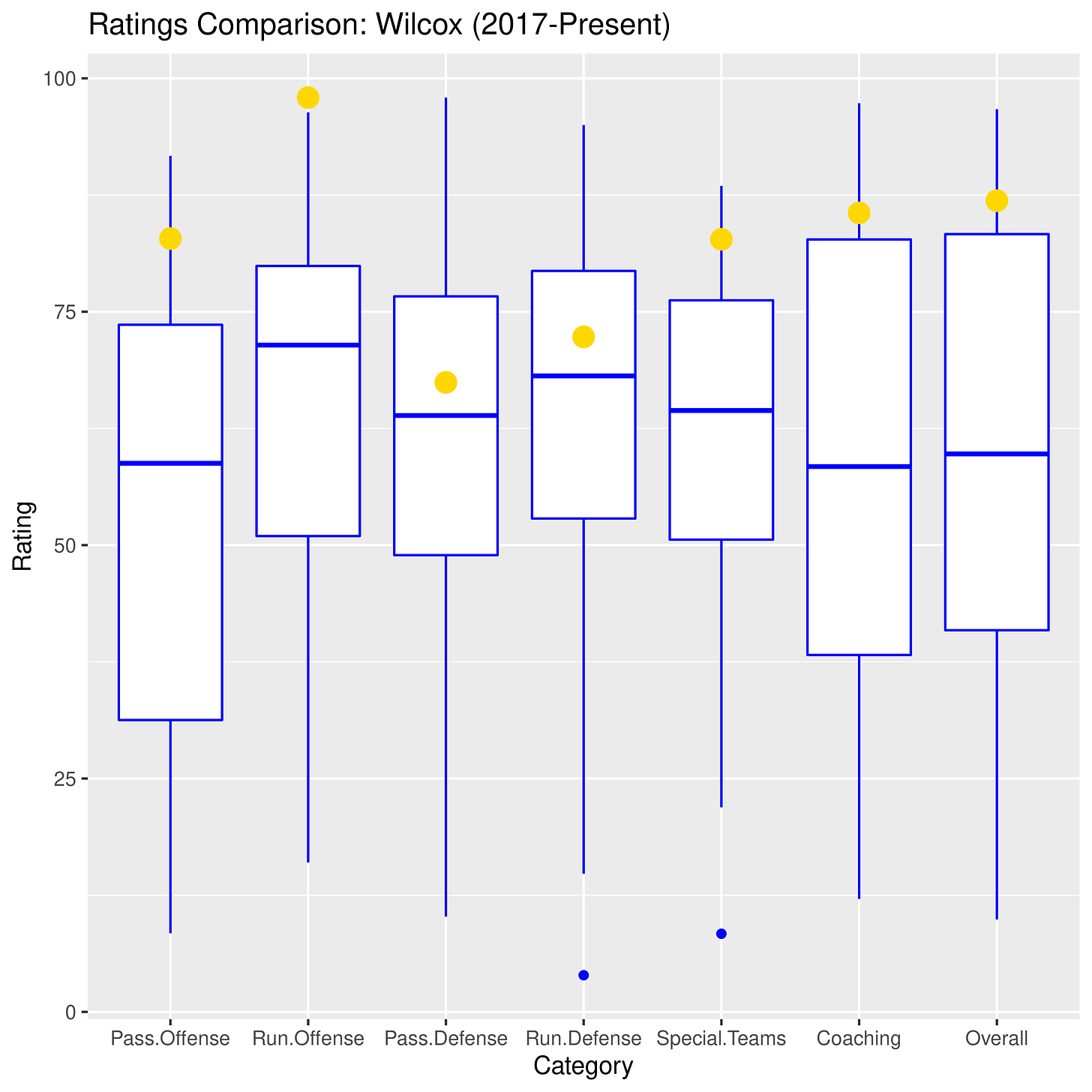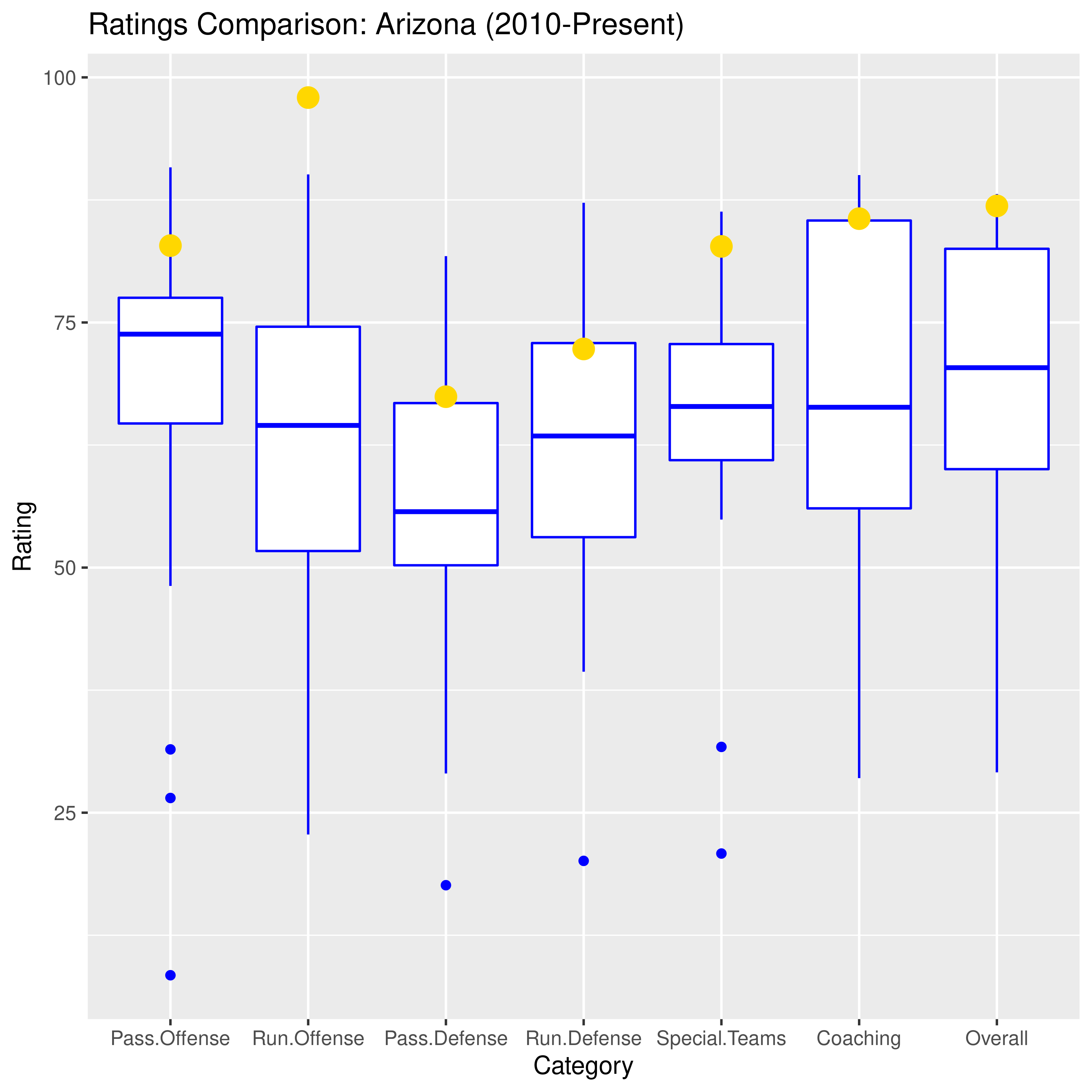 In the above plot the horizontal line represents the median (exact middle of the data) and the box captures data between the 25th and 75th percentiles. After over a decade of inconsistency and futility, the Bears finally turned in a solid, well-rounded performance against the Wildcats.