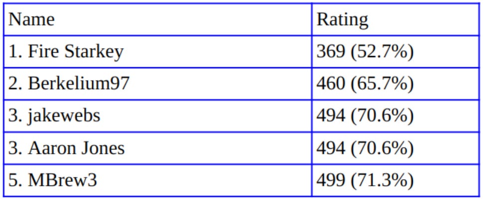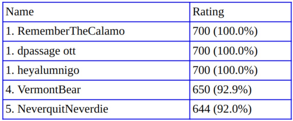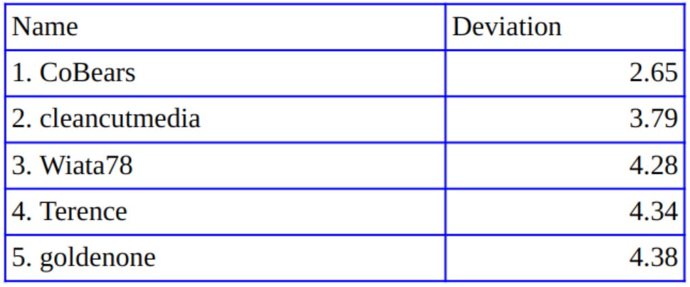 I praised goldenone for scoring in the 3s last week, and CoBears one-ups that with a 2.65! That is an exceptionally low deviation. We usually only see one or two 2s each season.