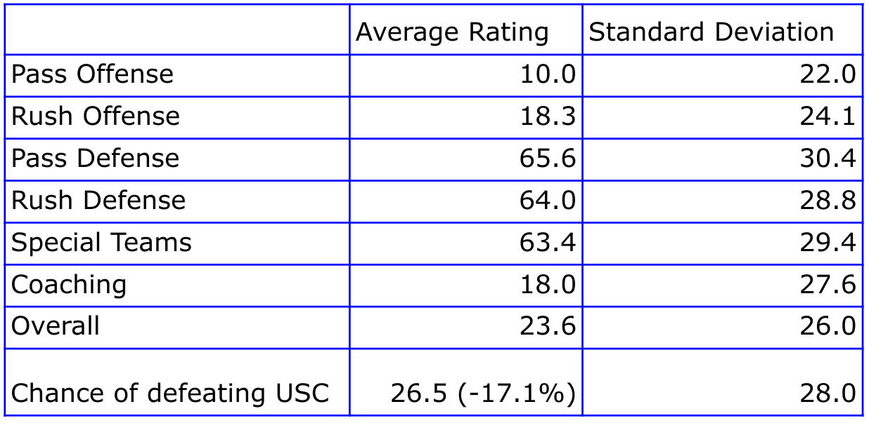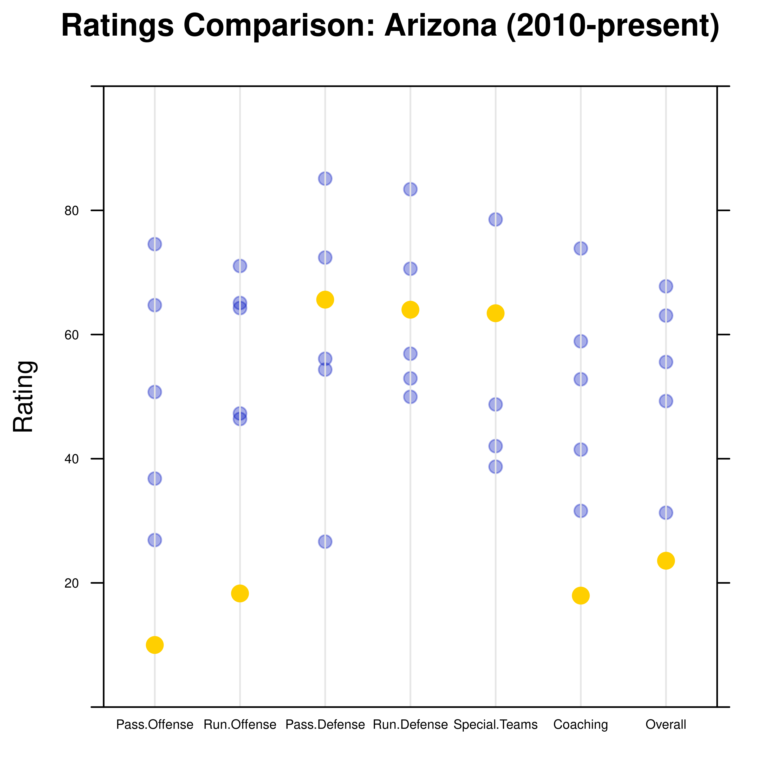 Defense and special teams were middle-of-the-pack while offense, coaching, and overall were the worst we have seen in the last 12 years of playing Arizona.