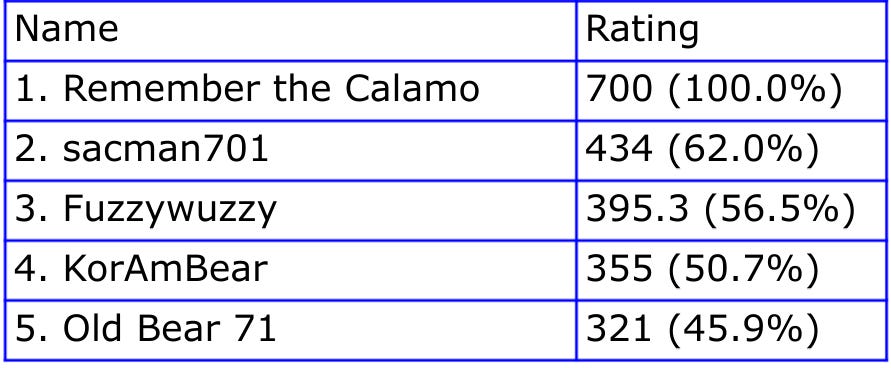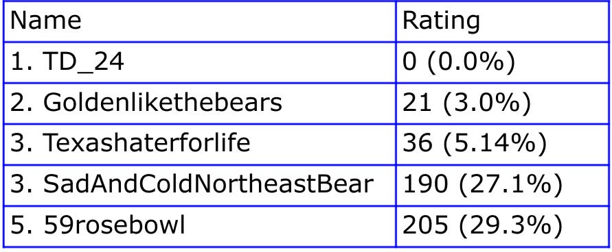 TD_24 leads the Old Blues despite probably being the youngest person to participate in the ratings this week. I admit I nearly gave the team all 0s but then decided to give special teams and defense some credit.