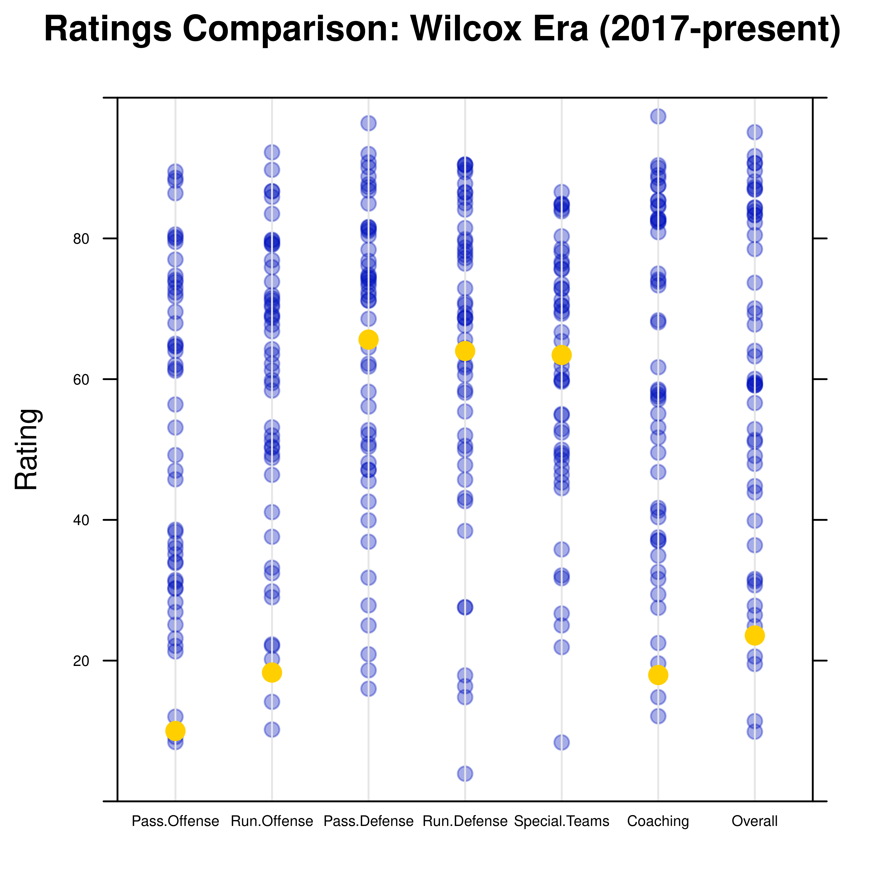 As expected, the offense earned abysmal scores. The pass offense was a rounding error away from single digits, a feat achieved only once from 2010 to 2016 and four times under Wilcox. That’s not a great sign for QB development...