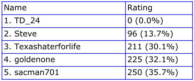 I was too incoherent and salty to give real scores that game was a win in the bag until it wasn't, which in turn caused all of the salty 0's/