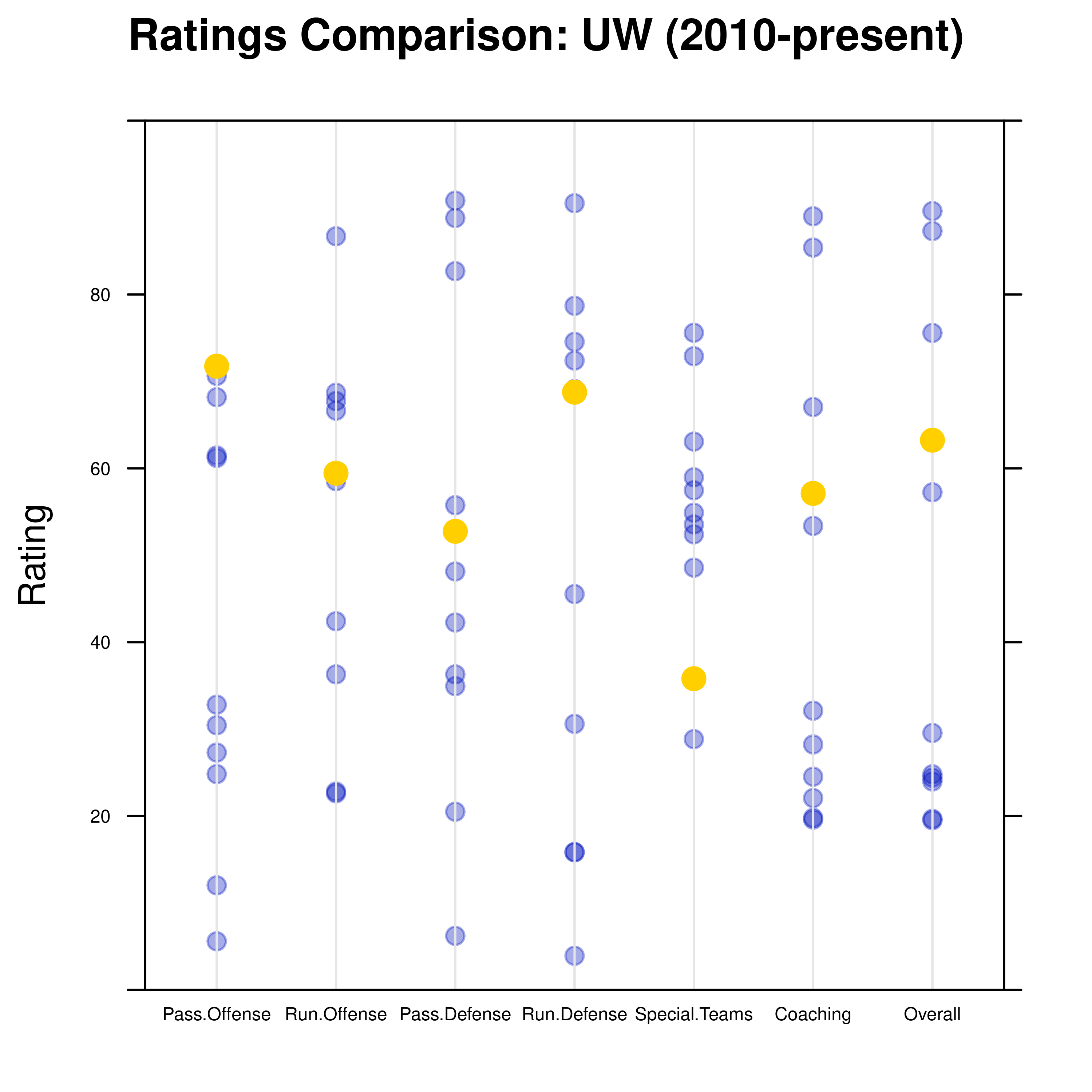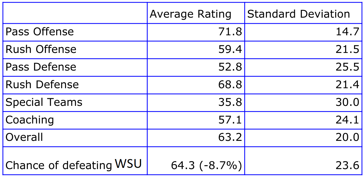 It’s been a bizarre series of games against UW in the last eleven meetings. Surprisingly, this one earned the highest scores for pass offense in recent memory. The rest of the categories ranged from average to slightly-above-average compared to recent games against the Huskies. Except special teams, because of course special teams turned in another agonizing performance.