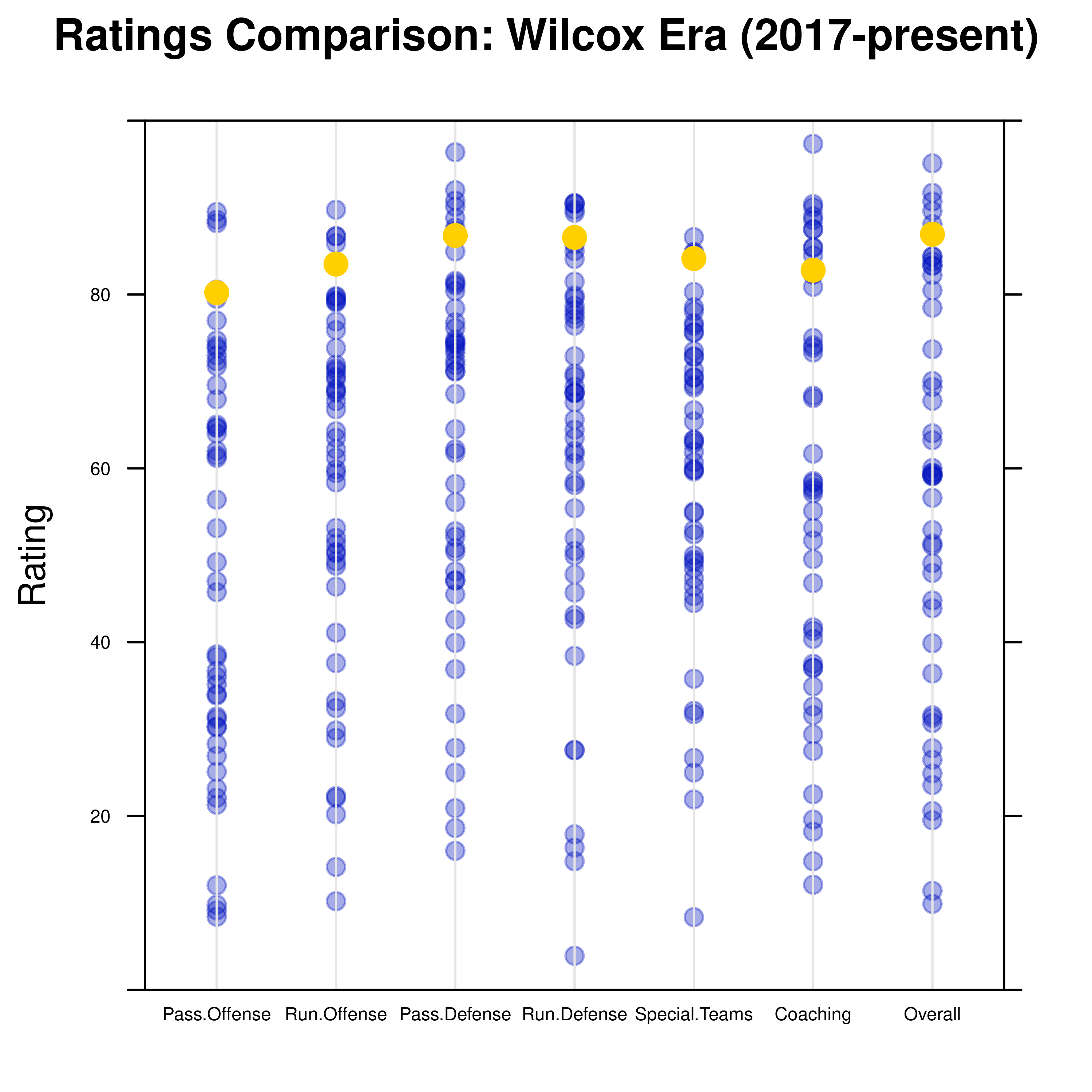 Compared to the other 50+ games in the Wilcox Era, Saturdayās performance was excellent although no single category stood out.