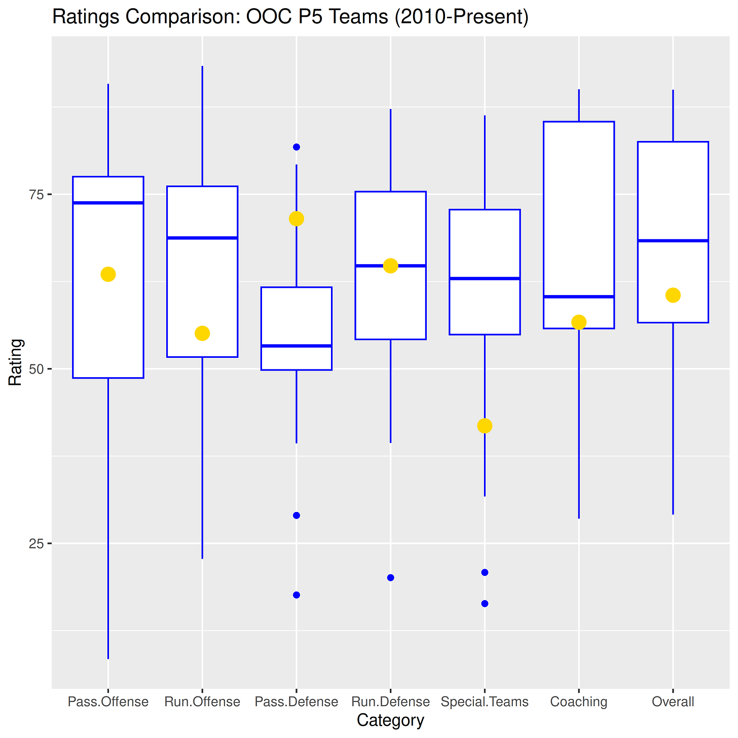 Instead of comparing Saturday’s ratings to a set of ratings capturing a long and storied of matchups with a specific conference foe, we’ll instead compare them to all our non-conference OOC matchups. And by the time we have enough data to have a meaningful comparison to all recent North Carolina games, for example, we will be in a new conference facing the likes of Hollywood Upstairs Medical College. Anyway, our comparison to OOC P5 teams shows that ratings were worse-than-usual across the board except for pass defense. Nothing was particularly egregious, except special teams, of course, but it’s not a good comparison.