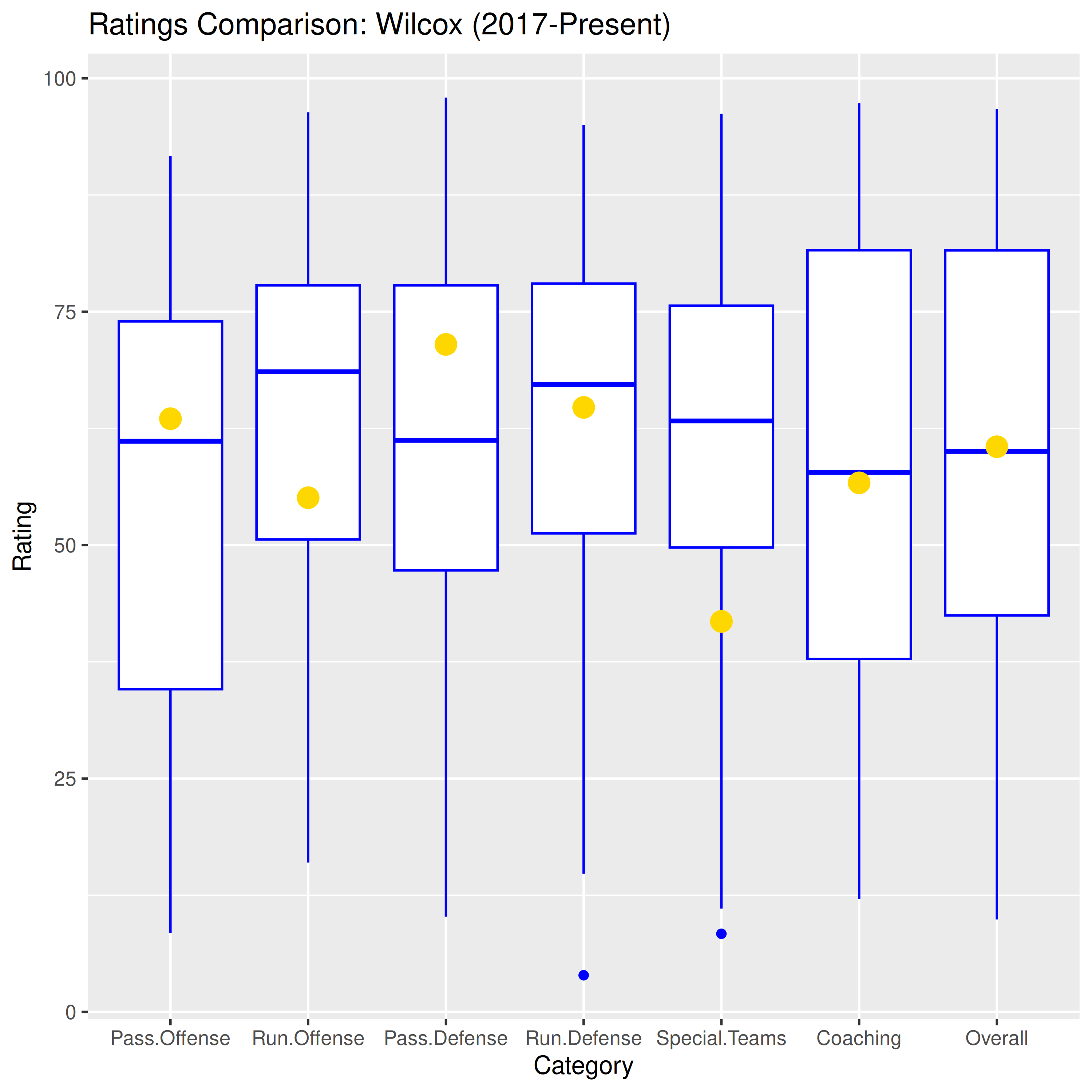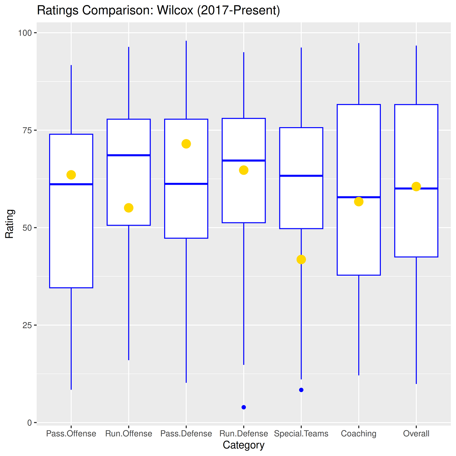 Pass offense is slightly better than usual and pass defense is notably better than usual. One of the most depressing stats is that the overall rating sits right on the median. What does the typical Wilcox game feel like overall? This one—coming up just short of a win that would have helped the program make a big statement.
