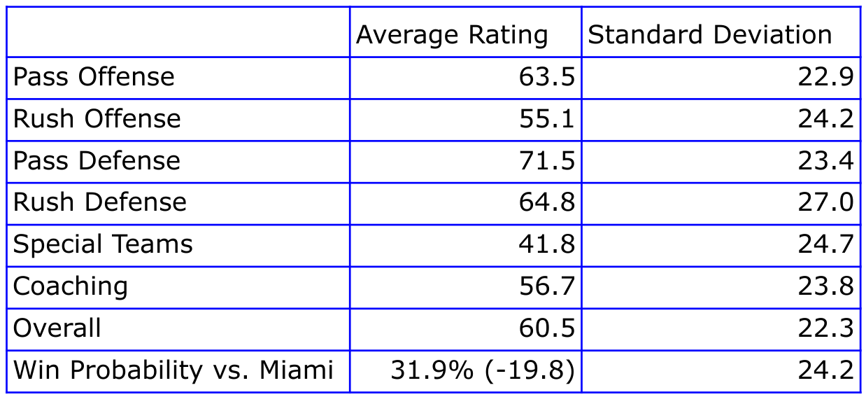 Heading into the season we thought the Miami game would be a toss-up and the matchup against a top-5 Florida State team would be the unlikeliest win of the year. Those two have now flipped positions as our predictions of a win over a now-unranked FSU hovered near 50% last week and the predictions of a win over a now-top-10 Miami have dipped into the low 30s.