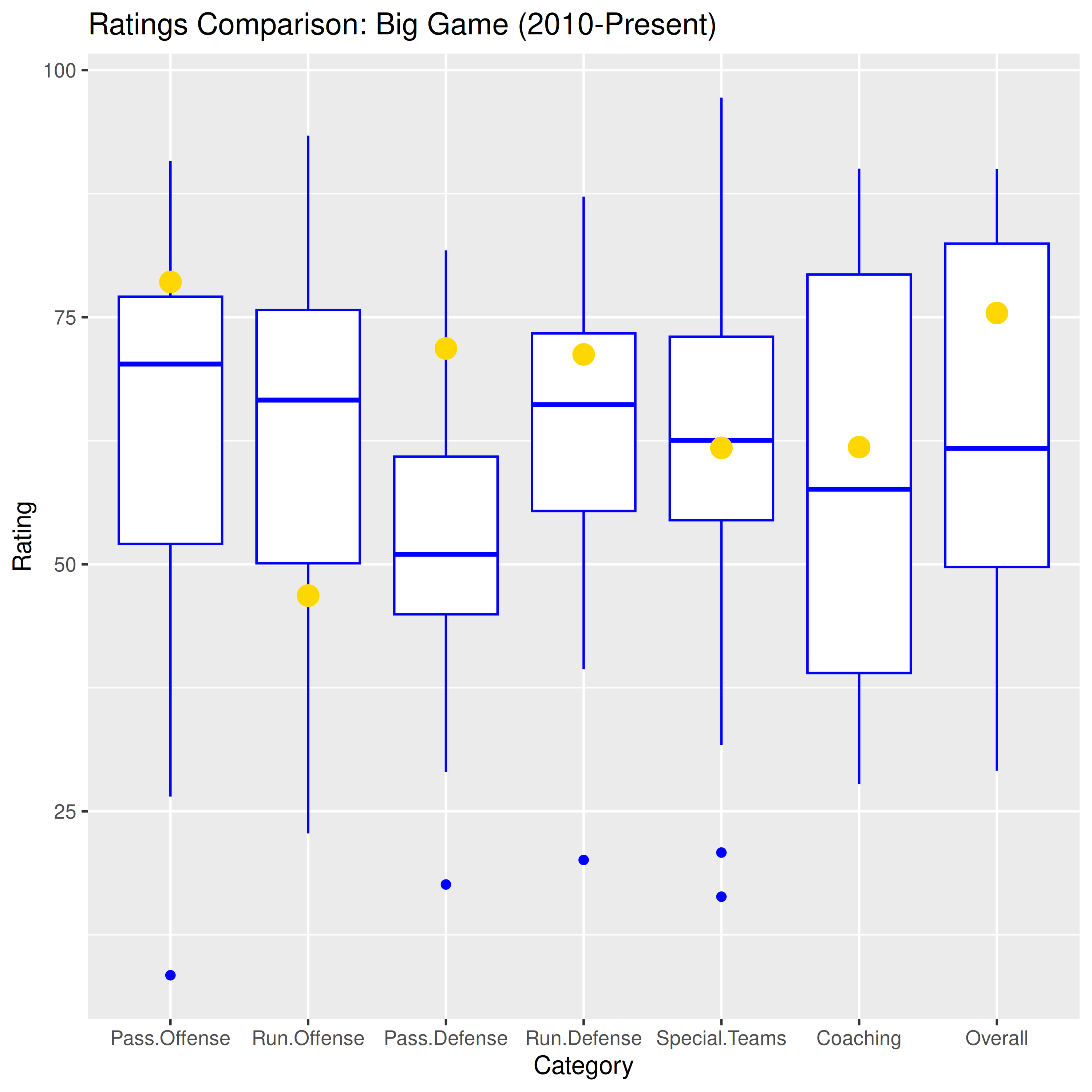 Run offense was much worse than usual, special teams was about typical, and everything else had better-than-usual ratings for a Big Game. Pass offense and pass defense especially excelled. The most volatile ratings in Big Game ratings (as evidenced by their longer boxes), coaching and overall fared better than usual.