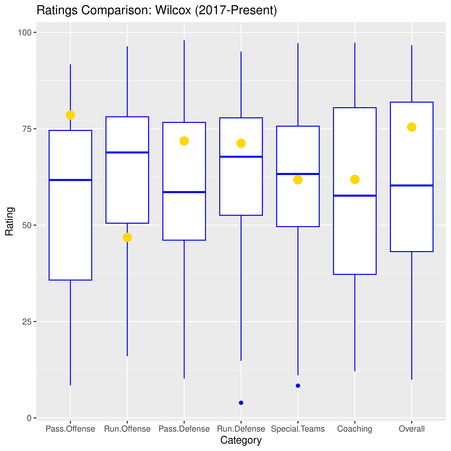 The next chart compares these ratings to all previous games in the Wilcox Era.