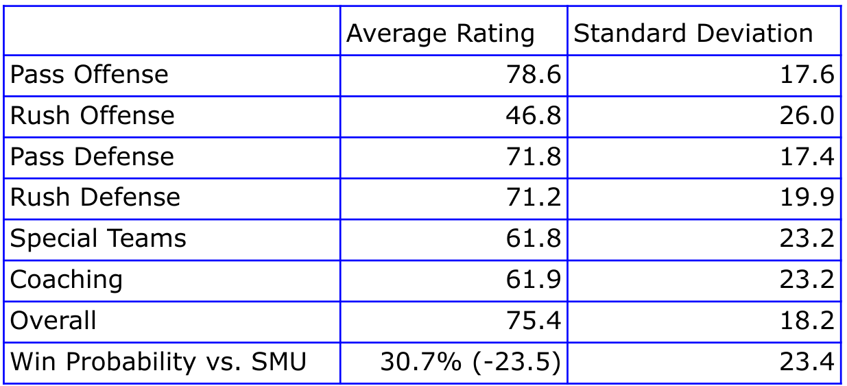 I haven’t gone back to compare all the ratings from this season (we’ll do that in December or January), but this one has an increasingly common statistical profile (in wins, at least). Pass offense and overall lead the way, both defensive categories sit just behind those two leaders, coaching sits a little farther down the ladder, and rush offense lags well behind the other categories. If this team had a merely average offensive line we may be heading into Dallas with ACC title hopes in mind. Alas, SMU has thrived in the new ACC and we have not and our predictions of a win have been nearly halved since August.