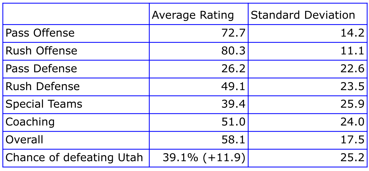 Both offensive categories lead the way by a large margin while pass defense earns the lowest score of the week, even worse than a special teams unit that seemed just as eager to let the Beavers saunter down the field. Run defense and coaching sit right around the middle of the rating scale while overall fares reasonably well for a loss. Thanks to this offensive resurgence led by Mendoza and the offensive void left by Cam Rising’s absence, our predictions of a win in Salt Lake City have climbed considerably since preseason.