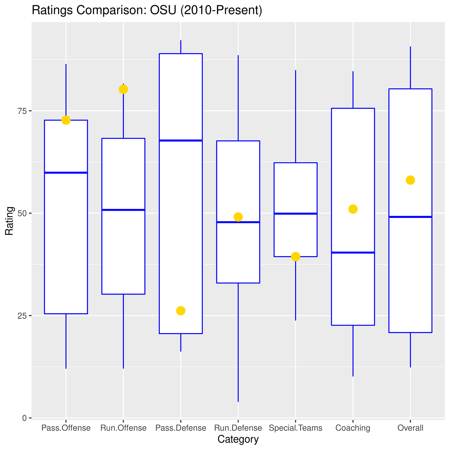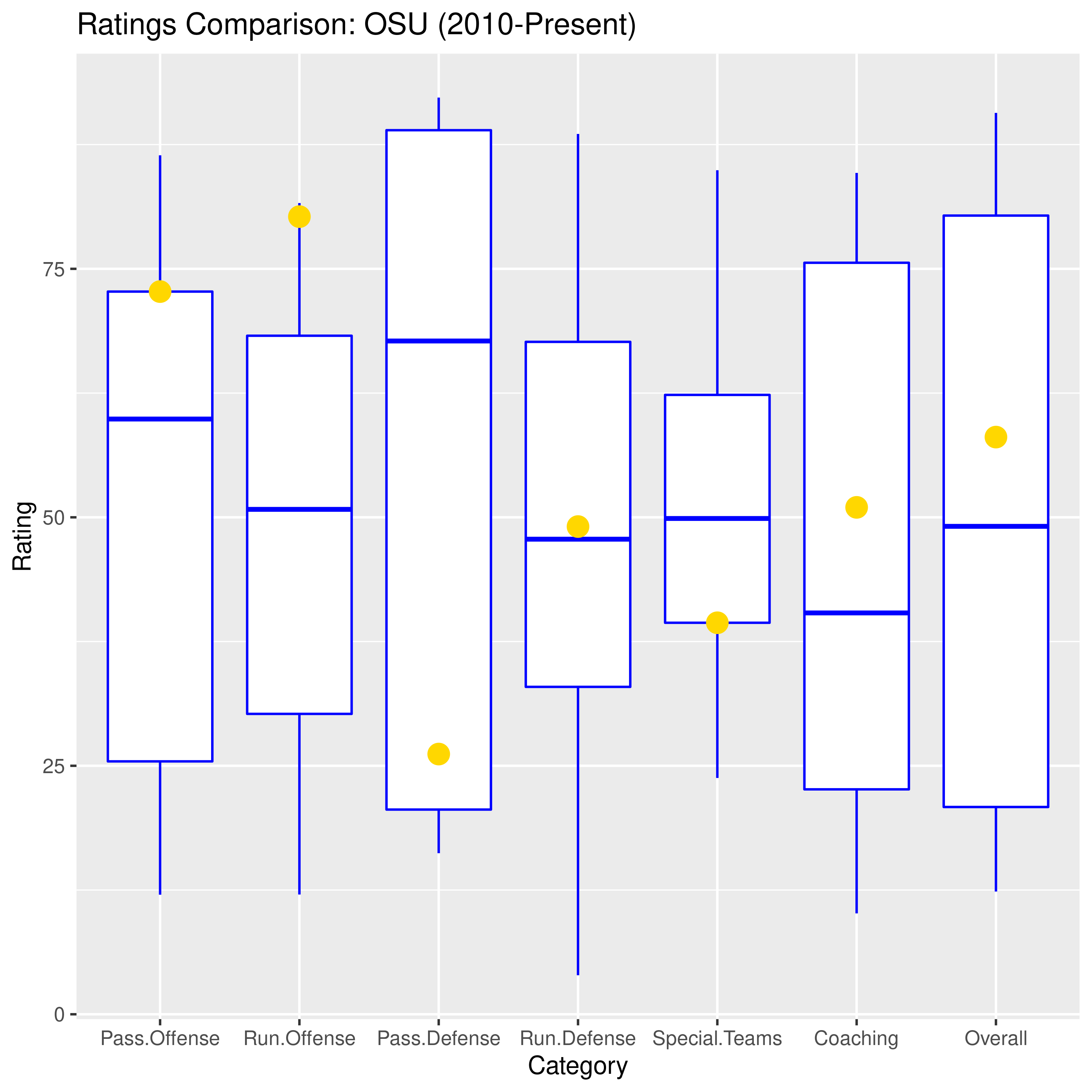 Over the course of this series OSU has been everything from a doormat to a legitimate Pac-12 title contender. As a result, our ratings have huge spreads. Remember, the box in the boxplots below captures the middle 50% of the data.