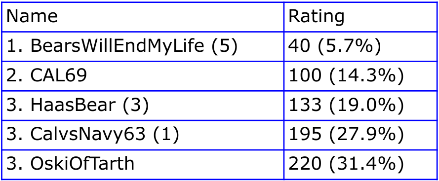Thanks to all who participated this season! Check back on August 31st around 5pm for the next opportunity to Rate the Bears after they take on UC Davis! It sounds far away, but it will be here sooner than you think…Go Bears!