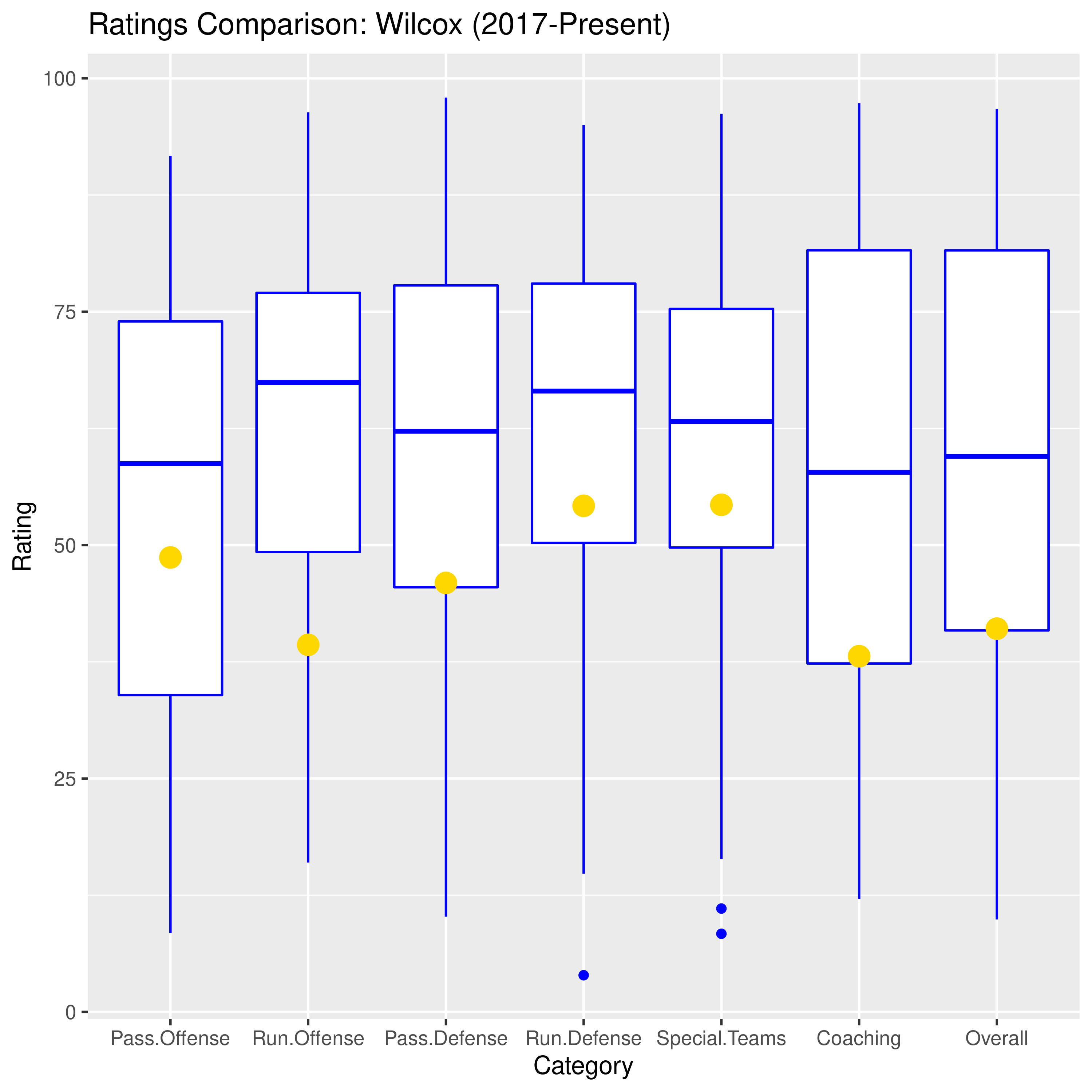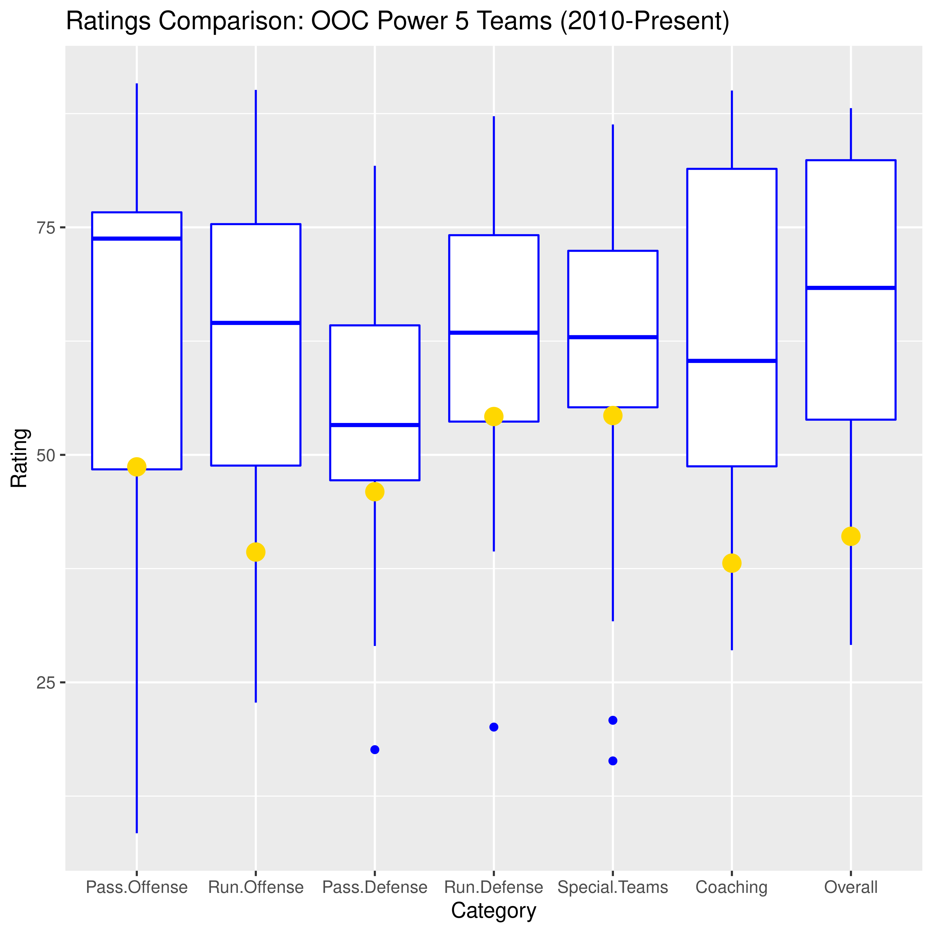 The boxes in the boxplot capture the middle 50% of the data, with the lines above and below the boxes representing the top and bottom 25% of the ratings, respectively. This tells us that every single category was rated in the bottom-25% for non-conference P5 opponents. Not good.